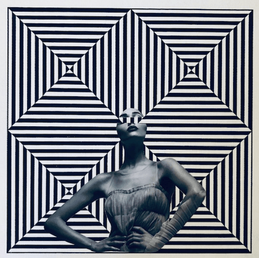 "My work navigates representational imagery and abstraction. I use of collage, recycled images, and materials in various analog and digital mediums. The mixed media images are constructed by designing in layers and superimposing formalizing grids to create pattern. The art I create is informed by architectural design and commercial art and my work becomes tri-dimensional. Using collage and geometry, my work tries to find a balanced composition between images, shapes, and fields of repetitive pattern."