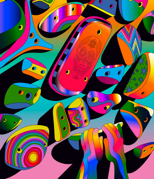 Carl Cozier, perhaps better known as Holy Moly: a multi-disciplinary, neurodiverse artist based in Bristol (UK). His work merges loud colour and pattern into energetic expressions of optimism and unity. Whether it’s inventive typography to inspire, joyous wearable patterns or surreal worlds to get lost in, it is always underpinned by an obsession with colour! Inspiration is everywhere; The natural world, mental health, street art, rave culture and everything in between.