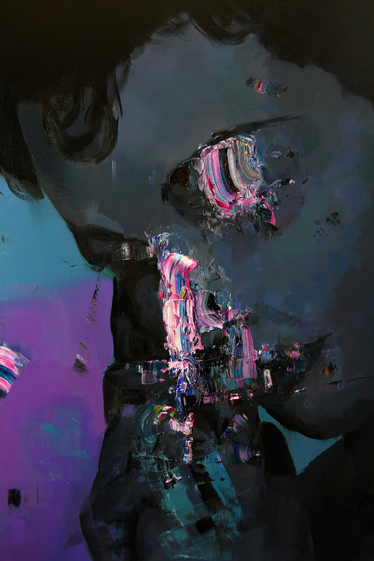 Among Jean-Luc’s influences is Victorian photography. His paintings are constructed through the processes of creation and destruction, damage and repair. Jean-Luc is obsessed with the materiality and texture of the paint itself. He embraces the transformations that take place when he is no longer a slave to the image and the painting becomes more about the paint and the surface. Inspired by the poetic beauty of darkness he tries to discover through his portrait what is on the inside, the essence of the portrait. A certain tension exists within the thick surfaces of his paintings, as paint takes precedence over representation. This creates a fantastic piece, embracing elements of Pop-art letting the inside escape the single dimension with heavy layered paint.