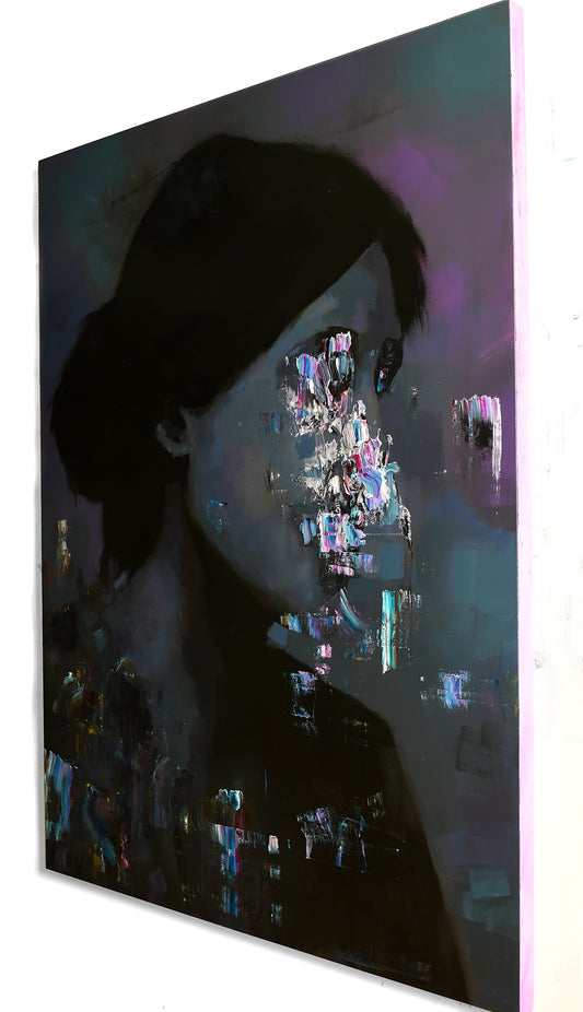 Jean-Luc’s highly textured oil paintings have a tangible, sculptural quality. Embracing the transformations that occur when not enslaved to the subject matter, he becomes obsessed with the materiality and texture of the paint itself. A tension forms within the thick surfaces as paint takes precedence over representation, and a deeper psychological and emotional presence is unearthed. He meticulously constructs a portrait using multiple layers of oil before masking, erasing, and blurring features through bold impasto marks, scratching, and peeling. Traces of its history are exposed – an apparition or fading memory of what’s beneath. Jean-Luc’s Dark Head paintings play with light and darkness. Ambiguous subjects emerge from – or disappear into – the shadows, hints of concealed features are illuminated, and the viewer is enticed to search deeper.