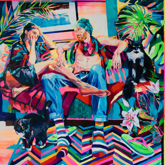 In her recent vibrant paintings, a contrast to her earlier work, she focusses on self-portraits, intimacy, femininity, self-care and relationship with her partner and nature. She says 'In my colourfully decorated flat filled with plants, and isolated from family and friends, my surroundings and my partner became my only world, more intensely experienced and observed than ever before.'
