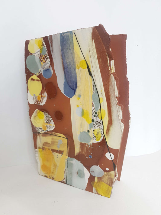"I create ceramic collages and assemblages inspired by the landscape. By capturing the essence of a place, working from a series of moments, relying on memories and emotions evoked, I explore colour and mark making with a vibrant and intuitive energy, creating expressive paintings on fired earth.