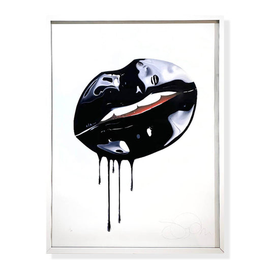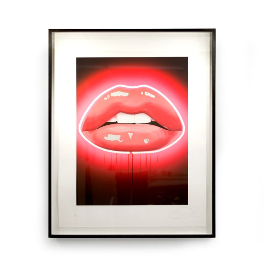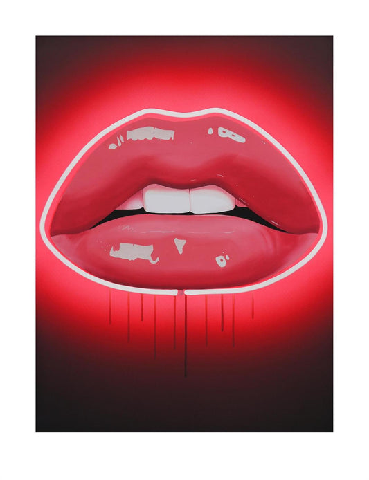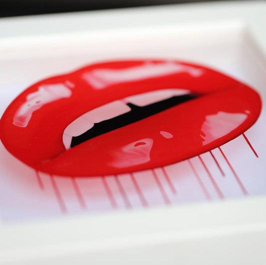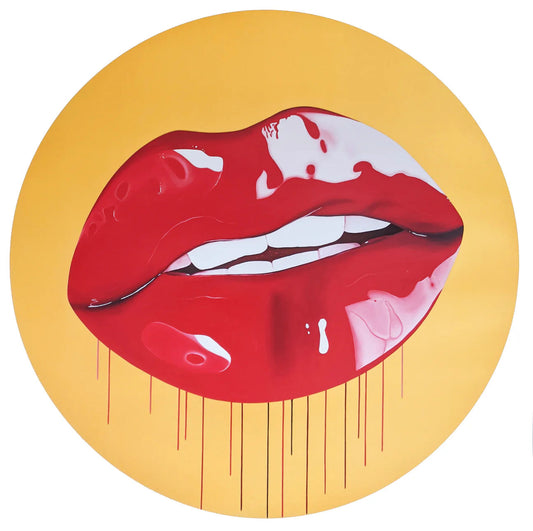 After establishing her career as a shoe designer, it's not hard to see the influence of this World in Sara's artwork. Working with life models she reproduces their lipstick-covered expressions in a style that mimics the pristine, airbrushed imagery of fashion. Pope's original paintings are created with a laborious technique that involves layering almost translucent oil colours until she achieves the desired effect.