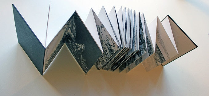 he original artists’ book Anima Mundi (“Soul of the World”) is a five metre long, graphite drawing on paper, presented as an A5 concertina book and slipcase. This is a beautifully printed and bound limited edition book and slipcase, limited to only 200 copies each signed and numbered by the artist. Tim worked on Anima Mundi for over two years and as such the drawing is rich in both imagery and emotion. The book’s title Anima Mundi comes from the Latin for “Soul of the World” and is according to several thought systems, an intrinsic connection between all living things on the planet; an energy which relates to our world in much the same way as the soul is connected to the human body.