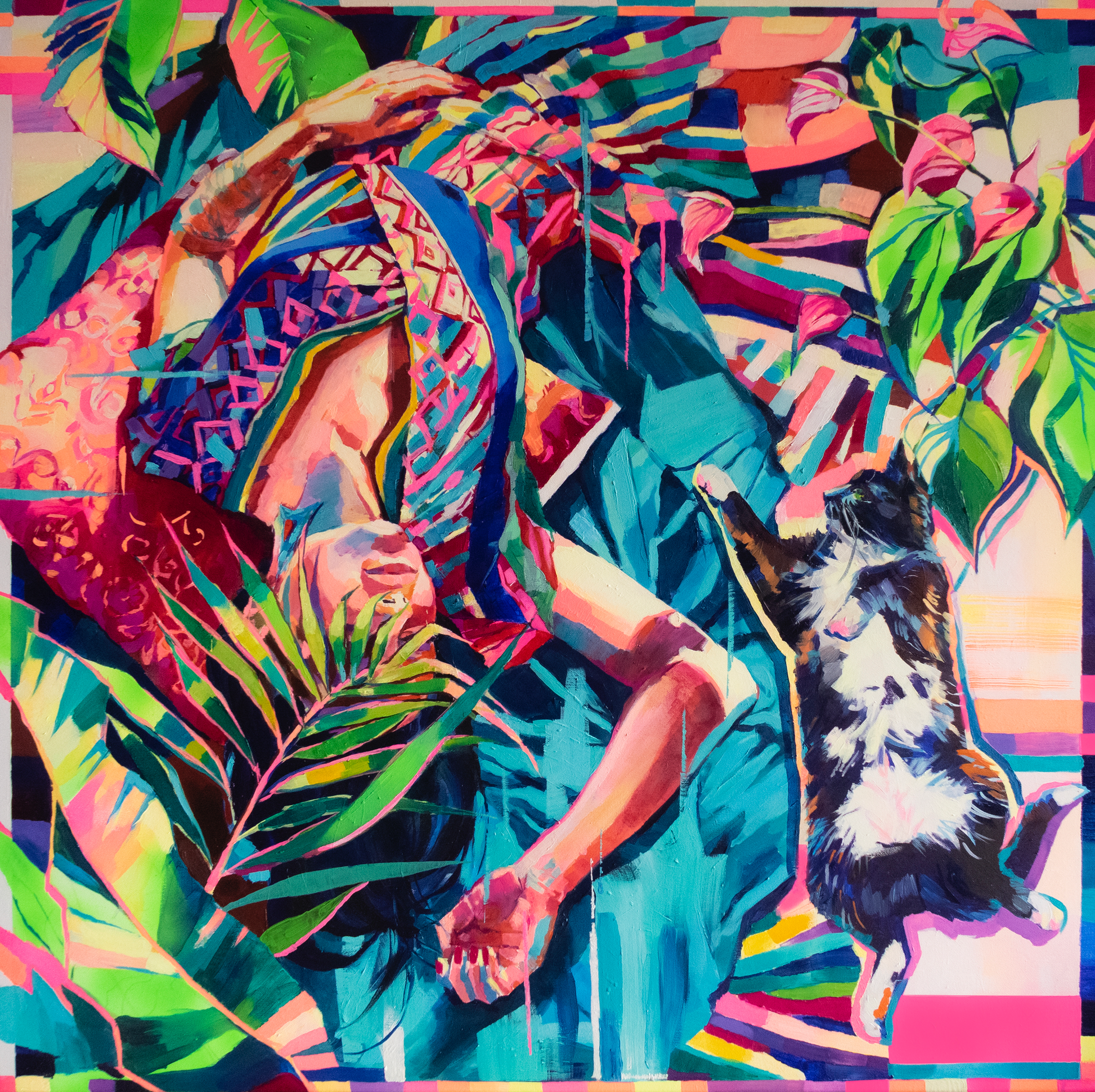 'Blue Velvet' - the first creation in 2022, a self-portrait of the artist. The scene shows a woman resting in her garden in the company of her cat Mia. Joanna shares her good moments of everyday life. She focuses on self-care and shares the importance of taking time for relaxation. Her paintings are always full of vibrant, clear colours and light. The scene is decorated with plants and various patterns. She wants the viewer to enjoy the same cheerful moment, catch a deep breath and put away all worries. Relax the whole body and mind.