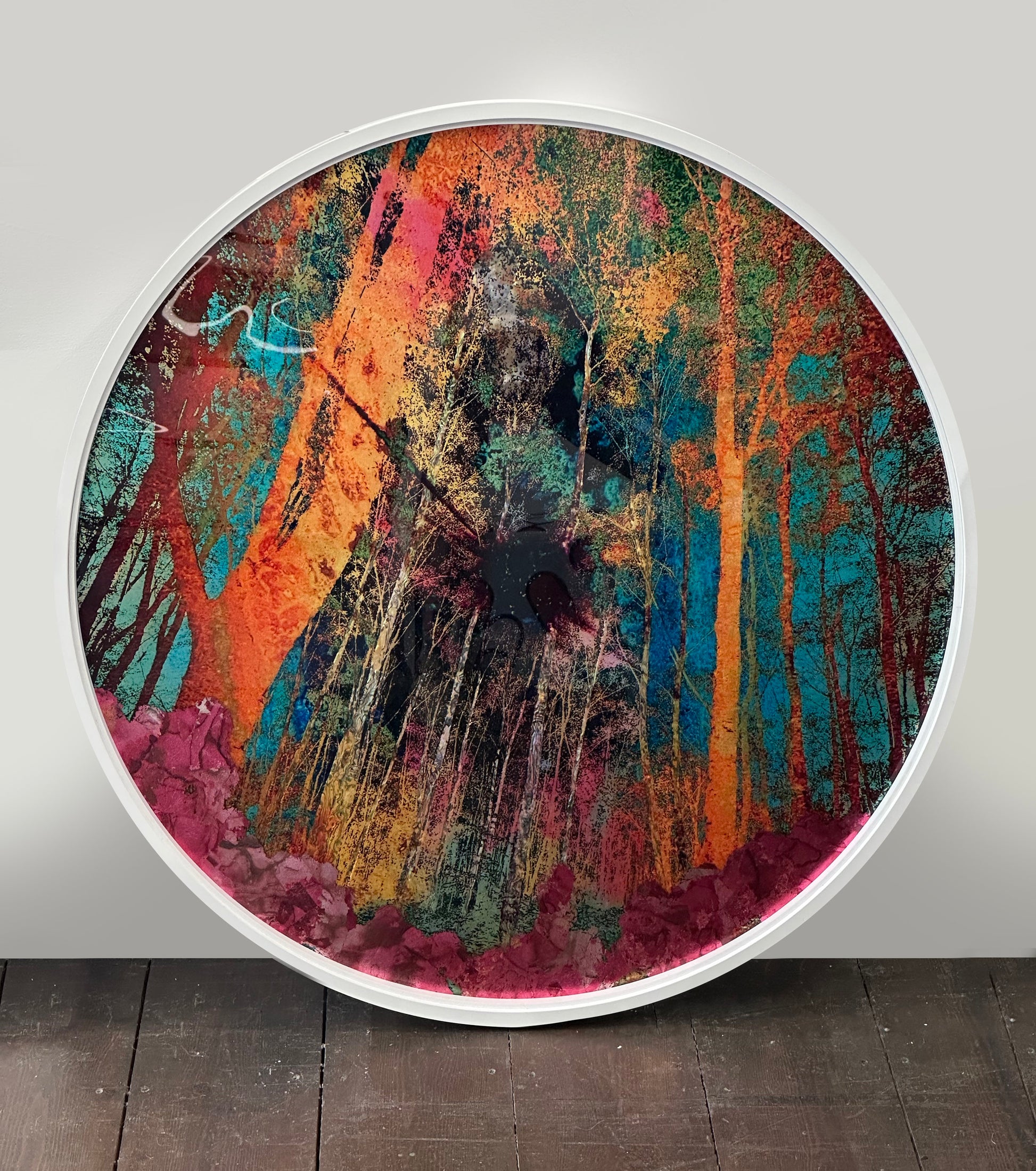 90cm x 90cm box framed in white frame with white spacer and art glass