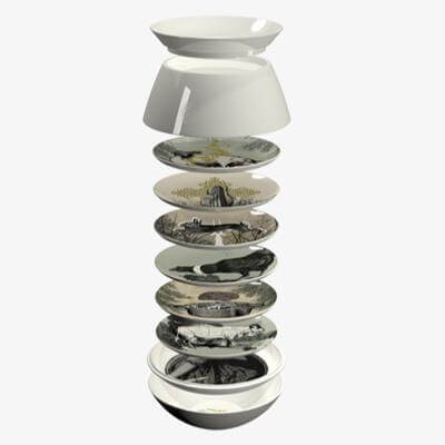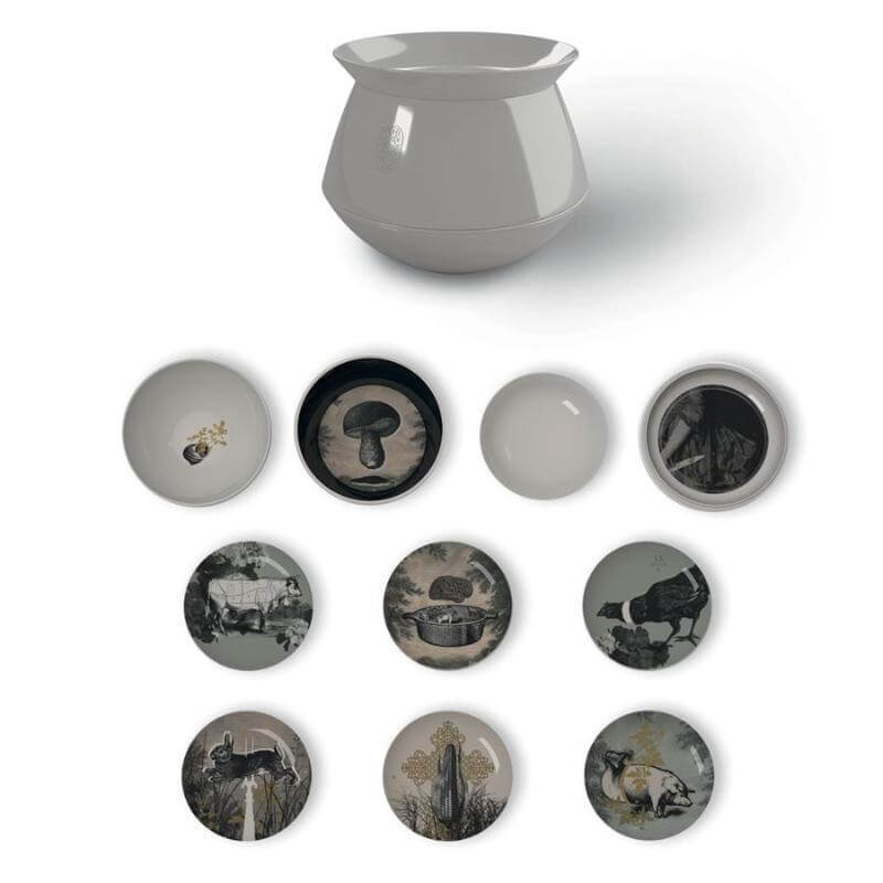 The Faux-Semblants collection's Ibride objects, are telling beautiful stories and reveal the creative Rachel Convers' roots. Her illustrations evoke his childhood and especially her vacations, spent in her grandparents' farm. Luso d'Antan set includes 4 stackable bowls and 6 dessert plates.